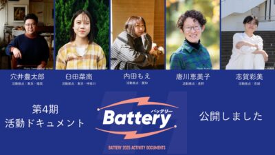 4期目を迎えた今年度の活動ドキュメントでは、バッテリーチームごとに振り返るメンティー・メンターのコラムや、各イベントレポートを掲載しています。今期から始まった合宿形式のプログラムのレポートを含む「オフライン共有会」や、これまで「バッテリー」に関わっていただいた有識者による「プロジェクトレビュー」も収録。ぜひご一読ください。